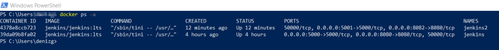 docker run –name jenkins2 -p 8082:8080 -p 5001:5000 -v C:/Users/username/Documents/jenkins-data2:/var/jenkins_home jenkins/jenkins:lts