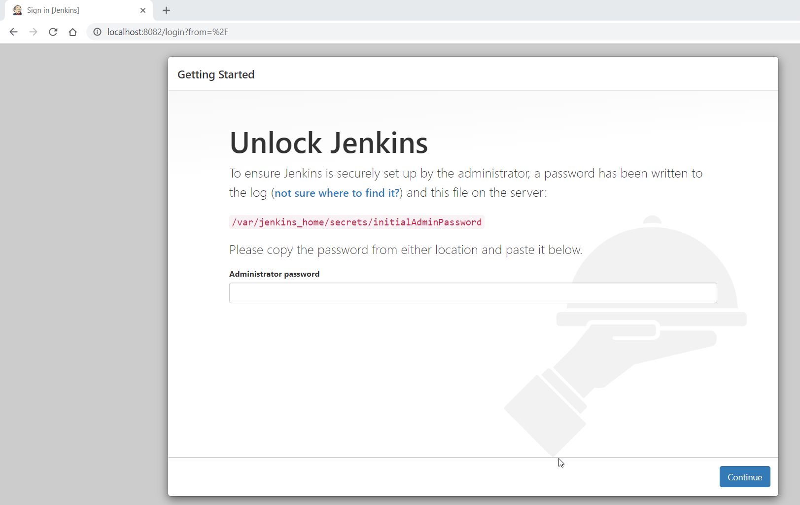–name ile belirtilen docker container adını belirliyoruz. -p ile verdiğimiz değerlerden ilki jenkins’in docker host üzerinde çalışacağı port değerini belirliyor, ikinci değer ise container içindeki jenkins portunu belirliyor. Yani container içinde 8080 portu host üzerindeki 8082 portuna map ediliyor. Benim örneğimde port bilgileri farklı ama siz aynı portlar ile eşleştirebilirsiniz. -v ile verilen değer ise docker container içinde yer alan jenkins klasörünü docker host üzerindeki bir klasör ile eşleştirebilirsiniz. Bunun faydası container içine girmeden jenkins dosyalarına docker sunucu üzerinden erişmemizi sağlayacaktır. En sonda yer alan jenkins/jenkins:lts ise kullanacağımız image adı ve tag’ini belirliyor. lts dememizin nedeni ise son sürüm jenkins kullanmak istediğimizi söylüyoruz. İsterseniz lts yerine sabit bir jenkins değerini de kullanabilirsiniz. Kullanabileceğiniz jenkins image tag’lerine buradan bakabilirsiniz.
