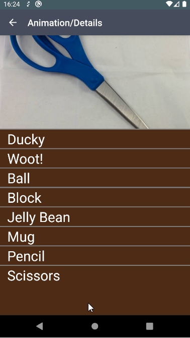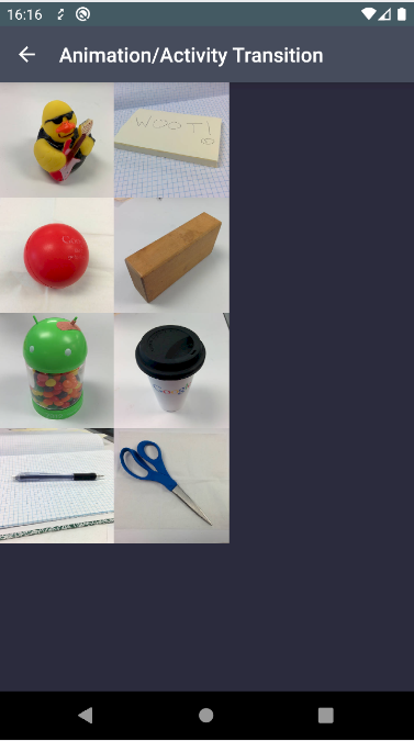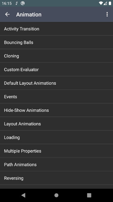 Bu ekranda da Animation elemanına tıklayalım. Yine benzer şekilde bu ekrandaki elemanların id’leri yine aynı. Burada da elemana tıklamayı findElementsById ile liste yapıp, index numarası ile tıklayalım. Index numarasını yine UI Automator Viewer ile bulabilirsiniz.