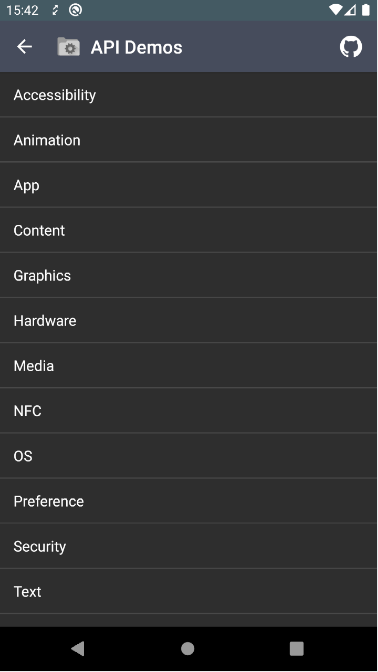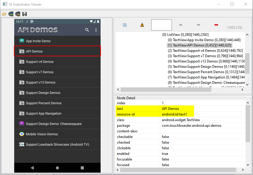 Bu ekranda menüde ikinci sırada yer alan API Demos elemanına tıklayalım. Ben burada eleman nasıl bulunuru anlatmayacağım ama elemanın özelliklerini bulmak için Android Studio’nun UI Automator Viewer’ını kullandığımı söyleyebilirim. Yada yine Appium kurduktan sonra Appium Inspector ile de bulabilirsiniz. UI Automator Viewer ile elemanın özelliklerine aşağıdaki şekilde ulaşabiliriz.